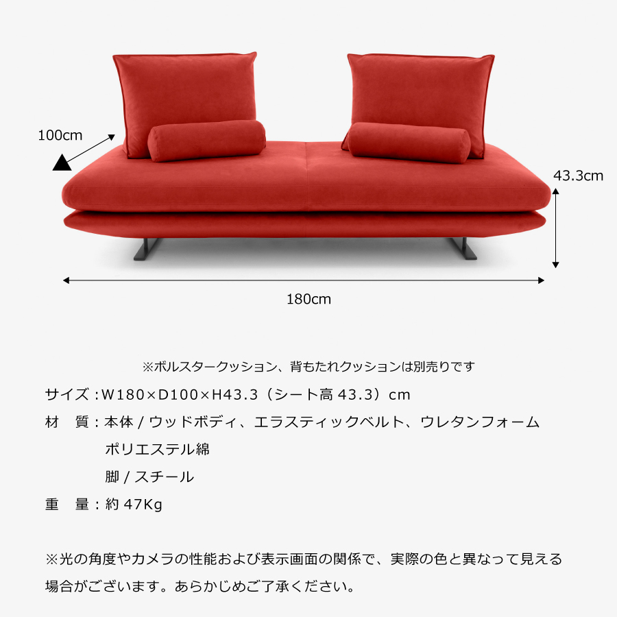 | 本体サイズ | 幅1800 × 奥行1000 × 高さ433 (mm) ※曲線部や若干の個体差があるため、表記と多少の差異が生じる場合があります。あらかじめご了承下さい。 |