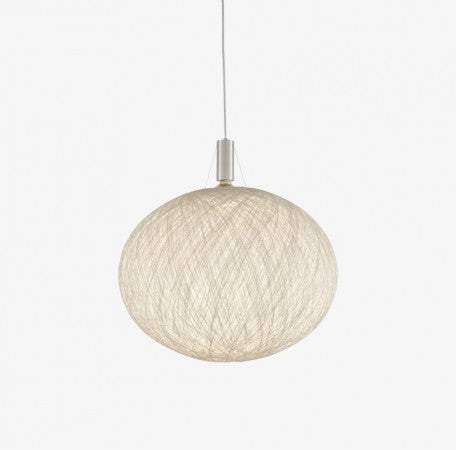 - 繊細なこのシェードは紙をファイバー状に分解して線形を作り、透明なPVCで補強しています。それらをバルーン接着で編み合わせ丸いデザインに仕上げています。